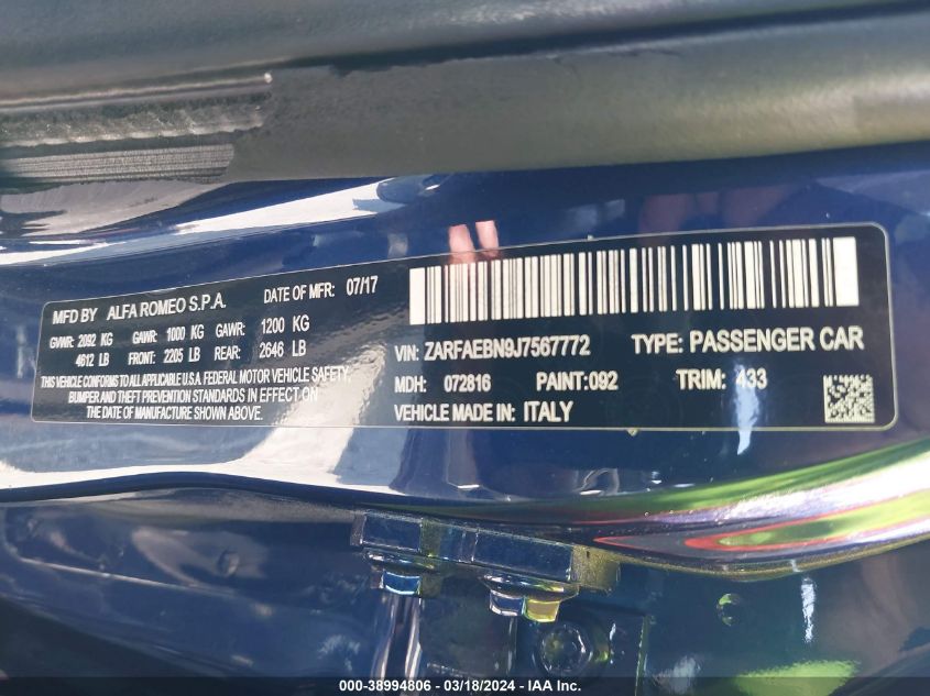 2018 Alfa Romeo Giulia Rwd vin: ZARFAEBN7J7594839